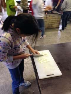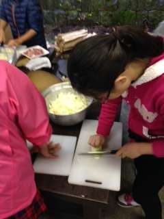 飯ごう炊さん奮闘中。煙で目がいた〜い!玉ねぎを切って目がいた〜い??