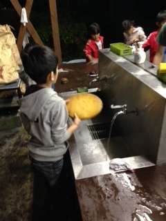 飯ごう炊さんの片付け。食器も鍋も使う前と同じようにきれいに洗いました。こちらは冷え込んで吐く息も白い。冷たい水でよく頑張りました。とてもえらいです。