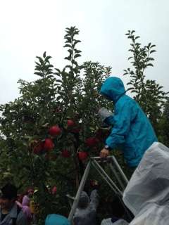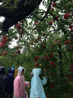 りんご狩り。小雨の中でしたが真っ赤に実ったりんごを手でもぎりました。また、じっさいにりんごを食べたり、りんごジュースを飲んだり。とても美味しかったです。その後雨天のためSLホテルで昼食をとり、田園プラザでお土産を買いました。バスは13時15分に田園プラザを出発しました。