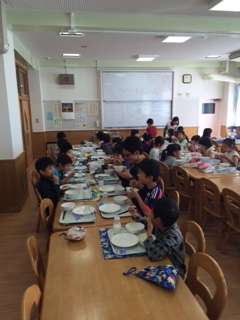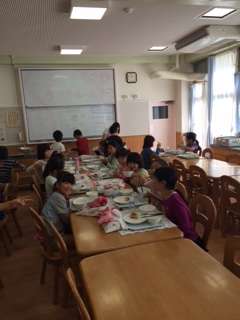 2-2のみんなが仲良くランチルーム給食を楽しんでいました。