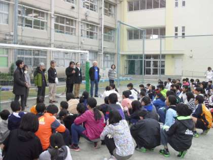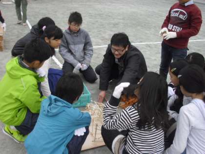 日本建築家協会世田谷地域会員の皆様をお招きし、校庭に巨大な建築物をつくります。材料は木材とゴムです。どんな作品ができたのでしょうか。