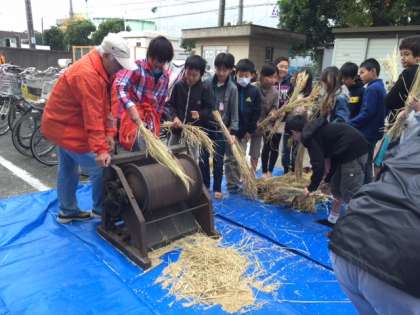 刈った稲もしっかり乾燥し、いよいよ脱穀です!