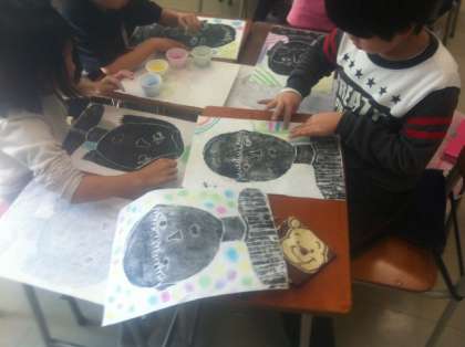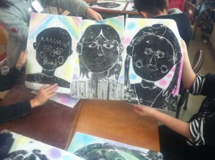 図工で紙版画をしました。まず鏡を見て似顔絵を描いて、カーボン紙で画用紙に写しながら紙を重ねていきました。似顔絵を描く作業は難しかったようですが、見るとよく似ています。黒いインクをローラーで塗った時は、一気に作った顔が真っ黒になってびっくりしていました。仕上げはチョークでカラフルに模様をつけました。色を混ぜて新しい色を作ったり、模様を工夫したりして、とても楽しかったようです。