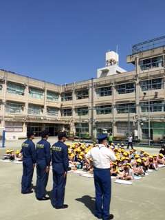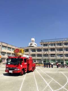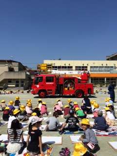 青い空、真っ赤な消防車、1年生の黄色い帽子。素敵なコントラストです。