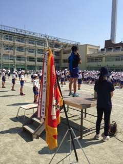 今日はついに全校練習がスタートしました。開会式、閉会式の練習とラジオ体操をやりました。優勝旗も登場です。
