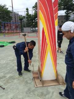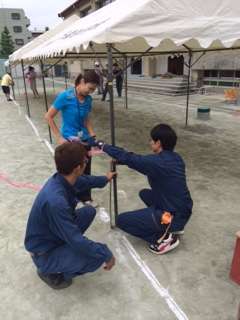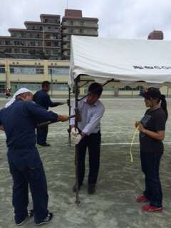 子供たちが帰ってから教職員でテント張りや杭打ち、ライン引き。なかなか大変な作業です。なのに雨がパラパラ。