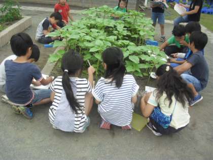 自分たちで植えたひまわりやホウセンカがあっという間に成長しています。