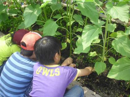 花の丘活動から帰ってきた足でそのままヒマワリの周りに生えた雑草抜きや支柱をつける作業を行いました。