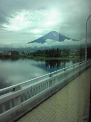 河口湖大橋から眺める富士山。ここでも逆さ富士が見えます。雲の上の緑の辺りが、五号目だそうで、雲頂と呼ばれるそうです。