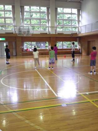 お風呂の後、体育館でドッジボールや野球をして遊びました。