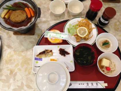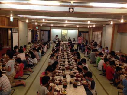 みんなで温泉に入った後は、お楽しみの夕食。よく食べています。
