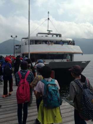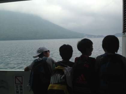 中禅寺湖の遊覧船に乗ってます。眺めを楽しみながらハイキングの疲れも少し癒される感じです。