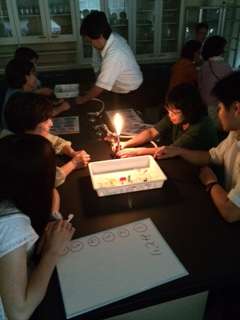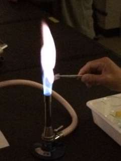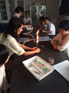 火の扱い方を学んだ後は、燃焼実験です。炎色反応を調べています。