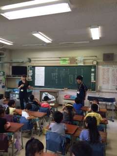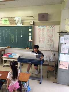 1年生の教室で歌の伴奏をしたり、質問に答えたり。担任の先生のアシスタントとして頑張っています。