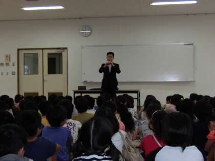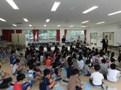 まず、講師の先生の演奏を聴きました。上手な演奏となじみのある曲に子どもたちは興味津々でした。