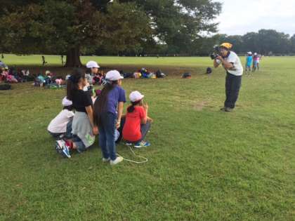 班遊びと自由遊びを大きな原っぱで楽しんでいます。これは、記念撮影を記念撮影しました。(^_^)