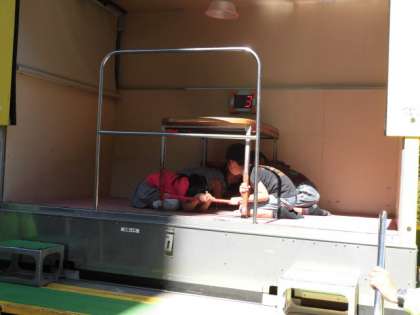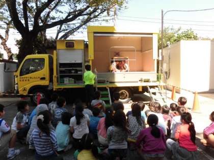 10月8日(木)避難訓練後に起震車体験がありました。震度7までの大きな揺れを体験しました。つかまっている机が動いてしまうほどの大きな地震のときは頭を第一に守り、正座でしっかりと机やいすのあしを持つことが大切だと学びました。