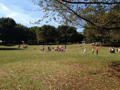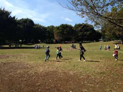 秋晴れの遠足日和になりました。祖師谷公園に着いて、さっそく1.2年生が一緒になってのグループ活動が始まりました。昨年は年下であった2年生が、今度は先輩の役割を果たそうと1年生をリードしてがんばっています。