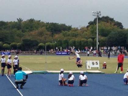 女子の競技が始まりました。100m走、50mハードル、走高跳び。千歳台小学校のブルーの短パンは他になく、とっても目立ちます。どの子も全力で頑張っています。