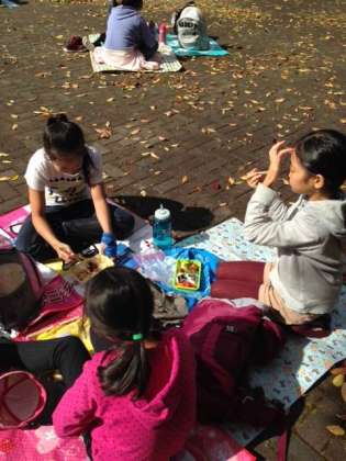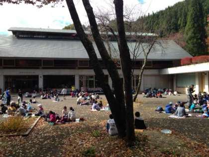 宿舎前の広場でお弁当を食べています。この自然の中で食べるお弁当は、また一段と美味しく感じるでしょうね。