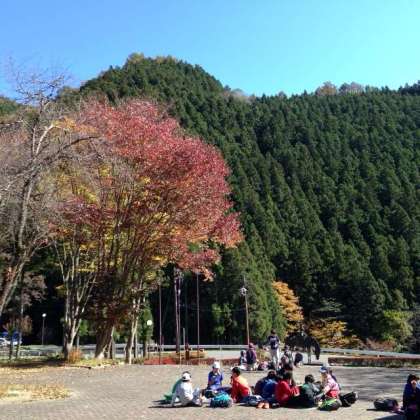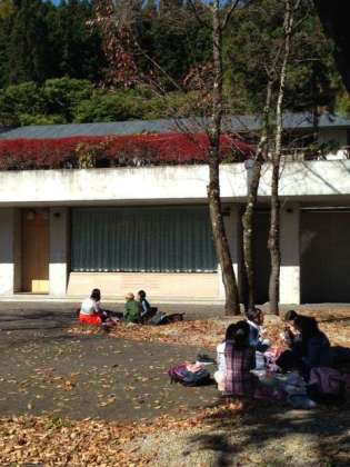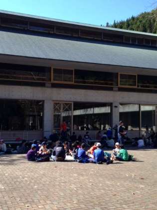 お弁当を宿舎前の広場で食べてます。お天気に恵まれていることが本当にありがたい。