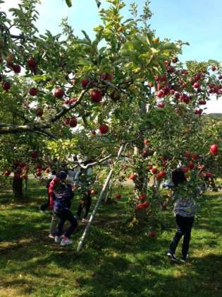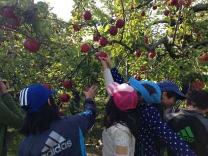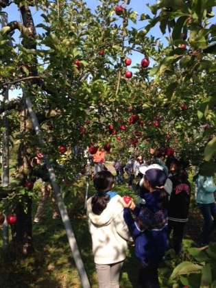 リンゴ園に着きました。お楽しみのリンゴジュースを飲んで、さっそくリンゴ狩りをしています。