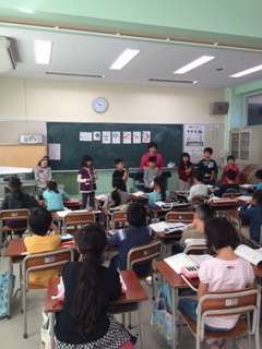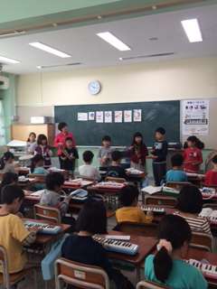 先日の2-3の音楽の授業の一コマです。みんな、お気に入りの打楽器をえらんで楽しく合奏していました。