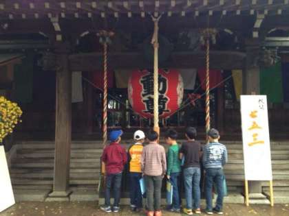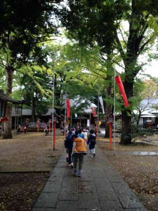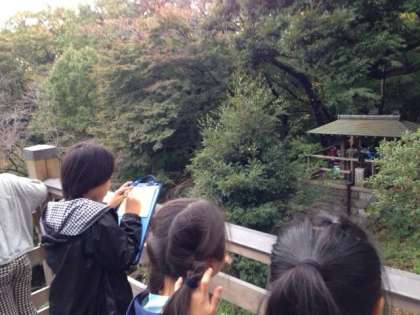 等々力不動を見学しています。国分寺崖線の端にあたる境内から等々力渓谷をのぞくように周囲を眺めています。