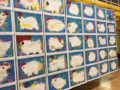 一つ目の平面作品は、かわいい子どもたちの手をダイナミックにつかって、逃げ出したイタズラにわとりをかきました。