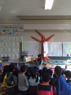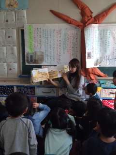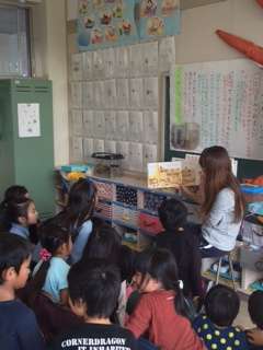 先生が絵本の読み聞かせをしてぃした。みんな目をキラキラさせてお話を聞いていました。