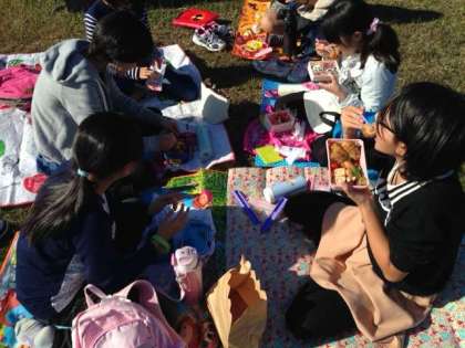 お弁当。最高の昼食になりました。こうやって外でみんなでお弁当を食べるのは、小学校最後です。