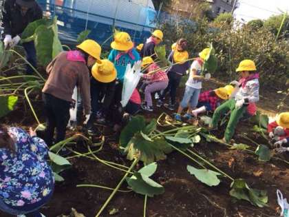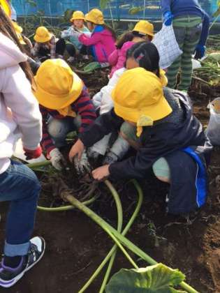 顔より大きい葉っぱの里芋を力を合わせて掘っています!