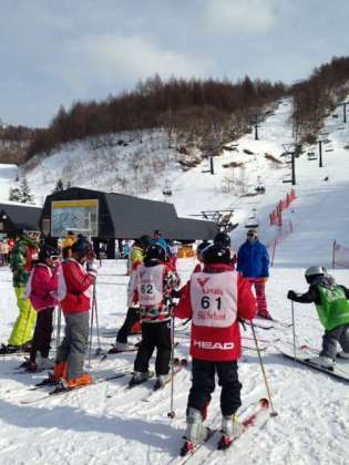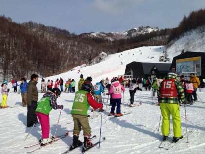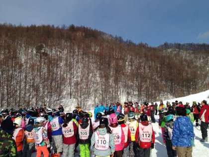 スキー場は青空。交流開校式を行いました。川場村の多くの方々にもお集まりいただきました。少人数編成で川場小の子供たちと共にスキー交流ができるのも川場村の皆さんのご協力があってのことです。みんな元気です。