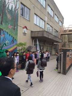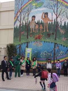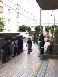 船橋希望中の生徒さん、めばえの役員さん、挨拶当番のクラスの皆さん、みんなで元気に挨拶して迎えています。