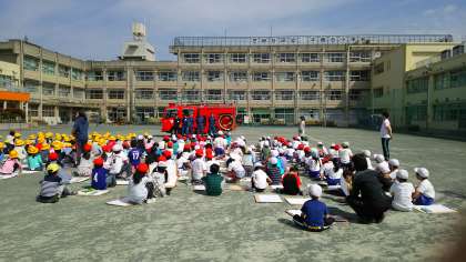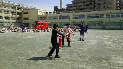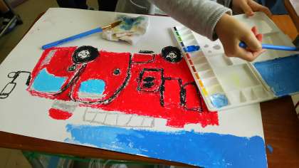 地震の時はどうするか、火事の時はどうするか。消防士さんから学んだ後は、思い思いの場所でクレパスでポンプ車を描きました。