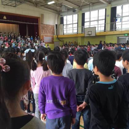 今朝は、今年度初めての音楽朝会でした。6年生のお手本を聴いてから、全校で歌いました。3年生もいい声がでていましたね。^_^