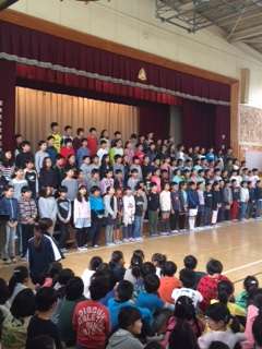 素晴らしい歌声です。さすが6年生。その後、みんなで校歌を歌いました。素晴らしいお手本に誘われてみんな大きな声で歌います。