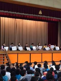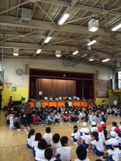 5.6年生と1〜4年生が向かい合って委員長が発表する時は各委員会のメンバー全員が立ちます。