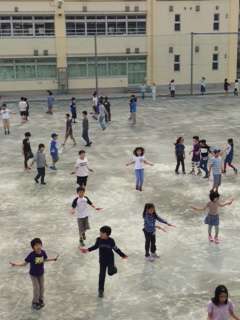 今月は縄跳び月間。音楽の合図で体操、縄跳び、休憩、縄跳びと行います。跳んだ数を縄跳びカードに記録します。さて、何回跳べたかなぁ。