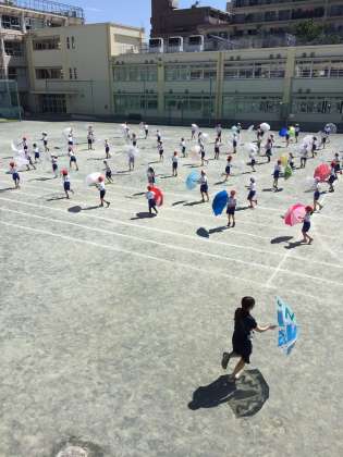 今日は昨日とはうって変わっての好天、校庭で、隊形移動の練習をしました。やはりやや高い位置から見ると傘の回転が良いですね。〔自画自賛ですみません〕^ ^
