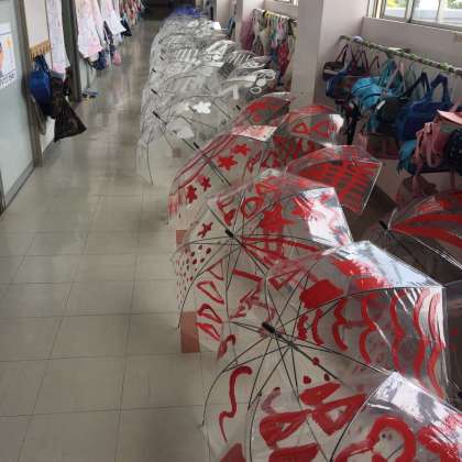 いよいよ今週末に迫った運動会。今日はパラソルの模様付けをおこないました。それぞれ個性的なデザインで完成しました。お楽しみにどうぞ。