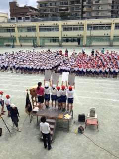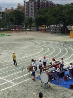 音楽係のドラムロールとシンバルの合図で得点係が得点発表をする練習です。司会も子どもたちが行います。