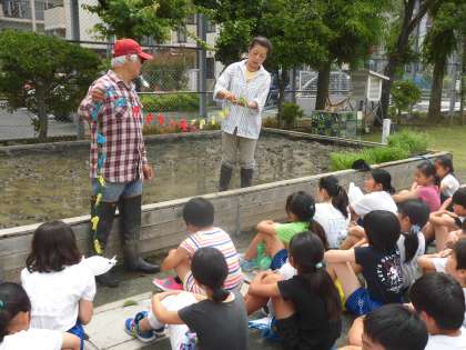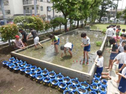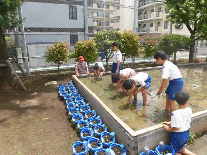 5月31日(火)。講師の先生をお招きしました。社会科と総合の学習「米作り」の第一回目の活動として「田植え」を体験しました。