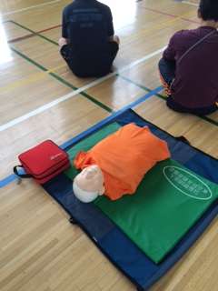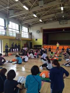 ただいま、体育館にて、救命救急法の研修中です。これから水泳のシーズンですから、万が一にしっかり備えます。人工呼吸、心臓マッサージ、AEDの研修をしています。
