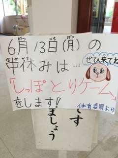 みんな元気に外遊びしようよと昨年度から体育委員会の皆さんが休み時間に様々な遊びを呼びかけてくれています。今日は残念ながら雨天のため明日に延期ですが、体力向上の基本は『元気に外遊び』ですね。