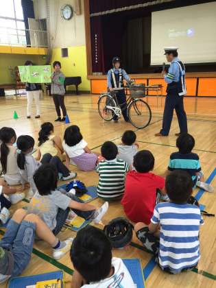 あいにく小雨のため、体育館で行われました。基本的な自転車の交通ルールを学びました。晴れたら早速しっかりヘルメットをかぶり自転車に乗ってみましょう。