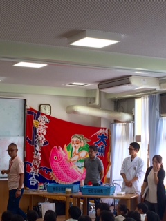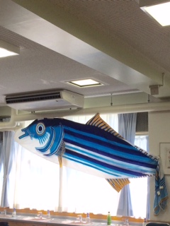 巨大なカツオと大漁旗がランチルームに飾られ、5年生の食育の授業がおこなれています。