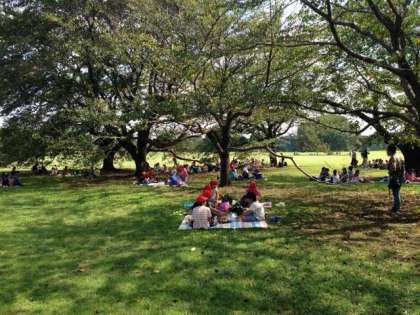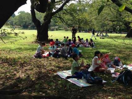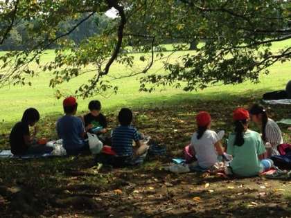 たくさん遊びました。汗びっしょりの子もいます。さあ、お弁当です。ハラヘッタあーの声が、正直な子供の声。グループごとに集まって木陰で 食べています。みんな元気です。