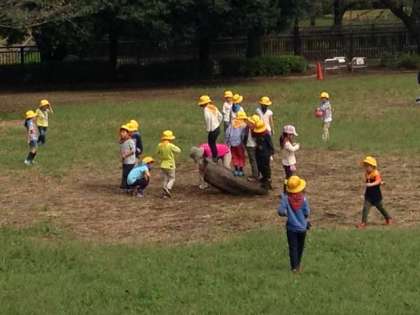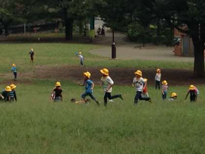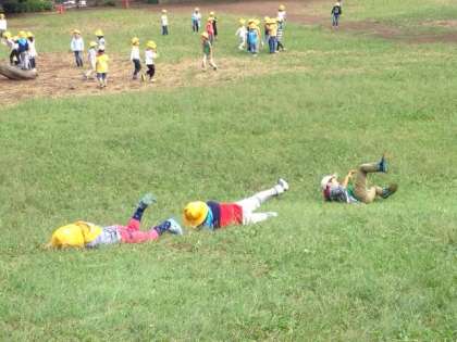 おやつタイムをとってから自由遊びの時間となりました。芝生の坂をゴロゴロ転がって遊ぶ子供。同い年の子供が集まるだけで、なにか活発化し始める子供のエネルギーにはすごいものがあります。