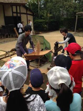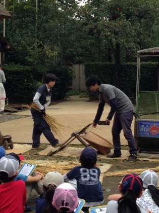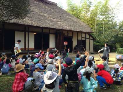 治太夫堀公園で古民家を見学しています。昔の世田谷の農家の暮らしをお聞きして、農具を使った作業を実際にやって見せていただきました。